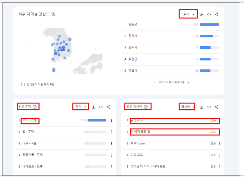 시간 흐름에 따른 관심도와 하위 지역별 관심도 그리고 관련주제, 관련 검색어를 한 번에 조회할 수 있는데 포도는 8월 중순부터 9월 말까지 뜨거운 관심을 보이고 있으며 포도철이 지나면서 관심도가 떨어지는 것을 알 수 있습니다. 하위지역별로는 제주 특별시에서 가장 관심이 높이며 경상북도 충청북도, 충청남도, 전라북도 순으로 관심도가 높았습니다.