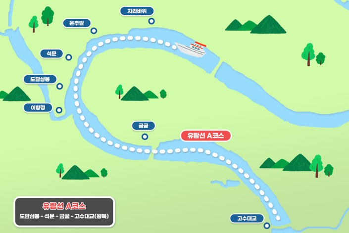 유람선은 약 50분 소요되며, 다양한 코스를 통해 도담삼봉의 아름다움을 감상할 수 있습니다. 주변 관광지로는 만천하 스카이워크, 고수동굴, 구경시장, 소노문 단양 리조트 등이 있어 다양한 즐길 거리가 있습니다.