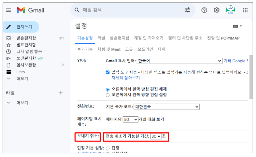 3. 지메일(gmail) 발송취소 시간 버튼 활성화