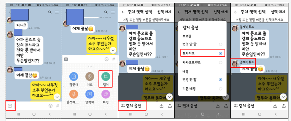 카톡을 캡처해서 다른 사람에게 보낼 때 프로필 사진과 이름이 공개가 되는데 모자이크 처리할 수 있다. 채팅방을 캡처하려고 하면 프로필과 이름이 다 나오는데 채팅방에서 아래 왼쪽의 플러스 버튼을 누른다. 그리고 캡쳐를 누른다.상단에 캡쳐를 시작할 말풍선을 선택하라고 하는데 터치 터치 하면 된다. 선택 해제 한다음에 다시 선택할수 있다.