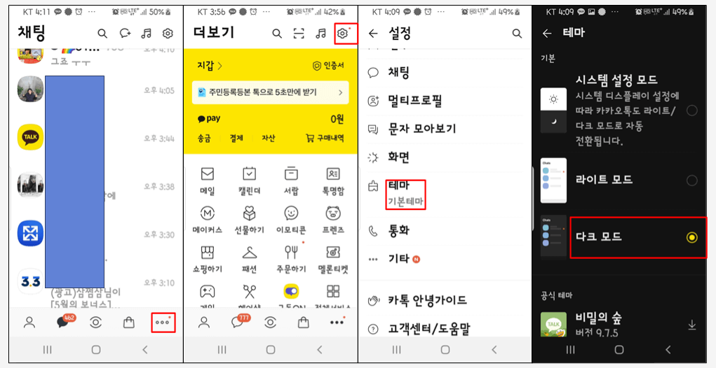 배경을 다크 모드로 변경하면 눈의 피로를 줄여줄 수 있고 배터리까지 조절할 수 있다고 한다. 카톡의 오른쪽 아래의 점세개를 누르고 상단 우측의 톱니바퀴 모양을 누른다.테마를 누르면 여러 테마를 설정할수 있는데 여기서 다크모드로 설정하면 전체적으로 검은색으로 바뀌었다.