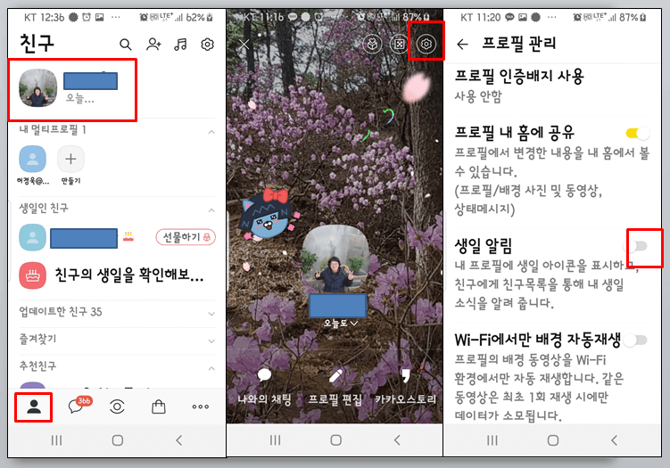 카카오톡에서 첫 번째 버튼인 연락처 버튼을 누르고 맨 위의 내 프로필 사진을 터치하고 오른쪽 상단에 톱니바퀴를 누르면 생일 알림 표시가 활성화되어 있다. 이것을 비활성화하면 내 생일이 내 친구들에게 알려지지 않는다.