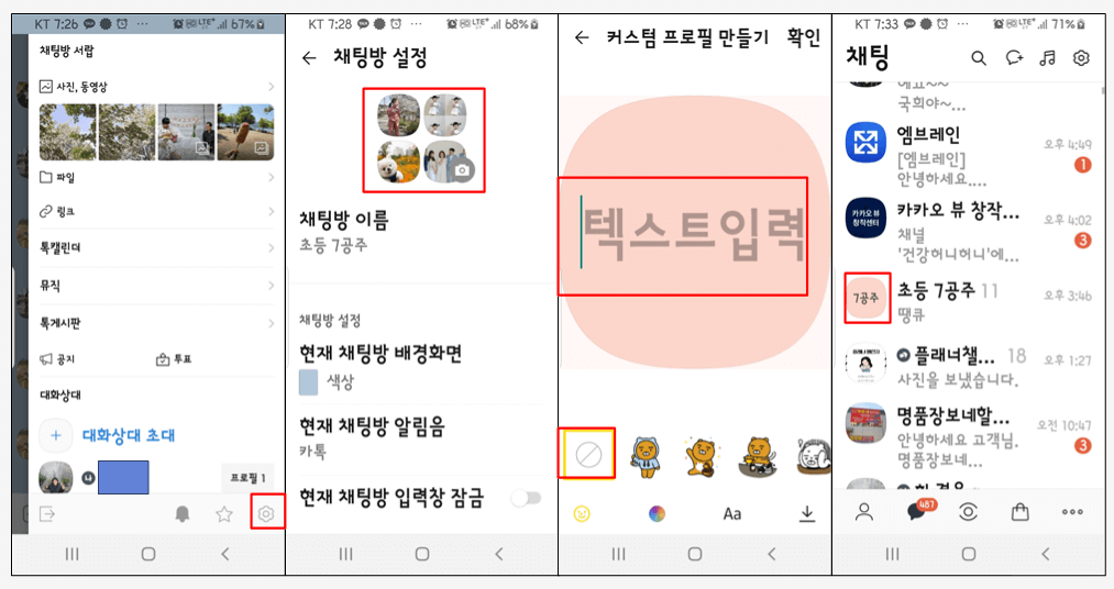 프로필 사진도 바꿀 수 있는데 채팅방에 들어온 다음에 오른쪽 상단의 점세개를 누르고 오른쪽 하단에 톱니바퀴 누르면 회원들의 채팅방 사진이 나열되는데 사진을 터치하고 커스텀 프로필 만들기를 누르고 캐릭터를 넣는 것도 좋지만 단색으로 하려면 맨 왼쪽의 부분으로 와서 7 공주라고 쓰고 확인을 누르고 나오면 단색으로 큼지막하게 이름이 나온다.