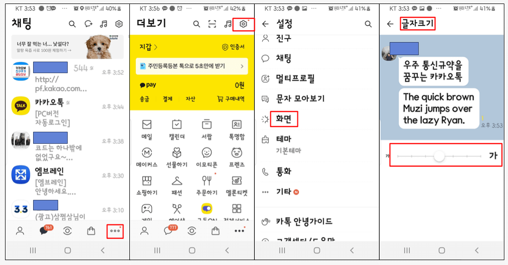 젊은 사람들은 괜찮겠지만 부모님들은 글자크기가 작으면 불편함을 느낀다. 카카오톡 오른쪽 하단에 점 세 개를 누른다. 그리고 오른쪽 위의 톱니바퀴 모양을 누른다. 화면을 터치하고 글자크기를 누르면 막대 바로 오른쪽으로 가면 커지고 왼쪽으로 가면 작아짐을 느낄 수 있다.