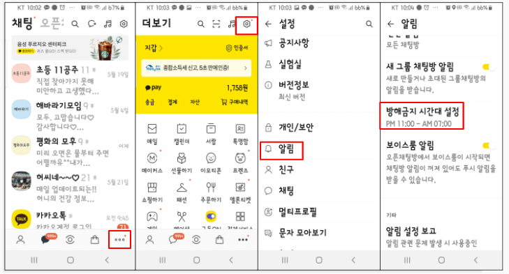 새벽에도 카카오톡 알림 때문에 스트레스받는 분도 있는데 그런 분들에게 유용한 기능이다. 카카오톡의 하단 우측의 점세개를 누르고 우측 상단의 톱니바퀴 모양을 누르면 중간을 보면 알림이 보인다. 그것을 터치하여 아래로 내려보면 방해금지 시간대 설정이 있다. 터치하여 방해 금지 시간대 설정을 활성화한다.