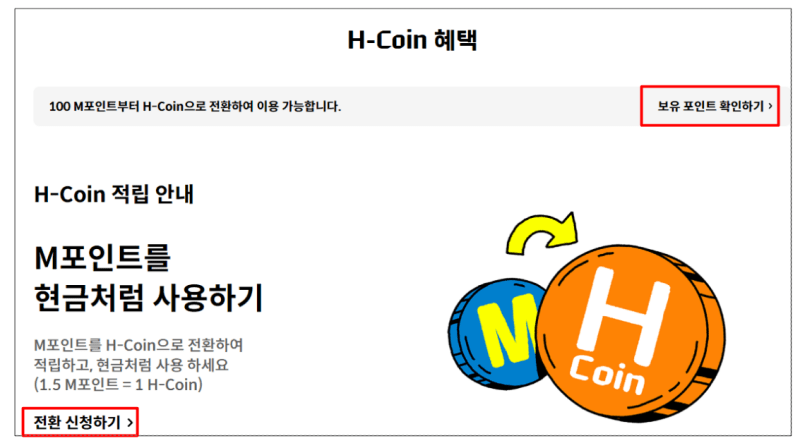 - 보유한 H-Coin을 확인하고 '전환 신청하기'를 눌러, 1.5M 포인트 = 1 H-Coin 비율로 전환합니다.
