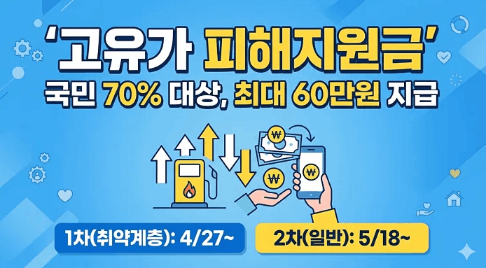 2026년 고유가 피해지원금은 국제 유가 상승으로 인한 국민 부담을 줄이기 위해 정부가 시행하는 지원 정책입니다. 특히 소득 하위 70% 국민을 중심으로 최대 60만 원까지 지급되면서 많은 관심을 받고 있습니다.이번 글에서는 대상자 기준, 지급 금액, 신청 방법까지 핵심만 쉽게 정리해드립니다.